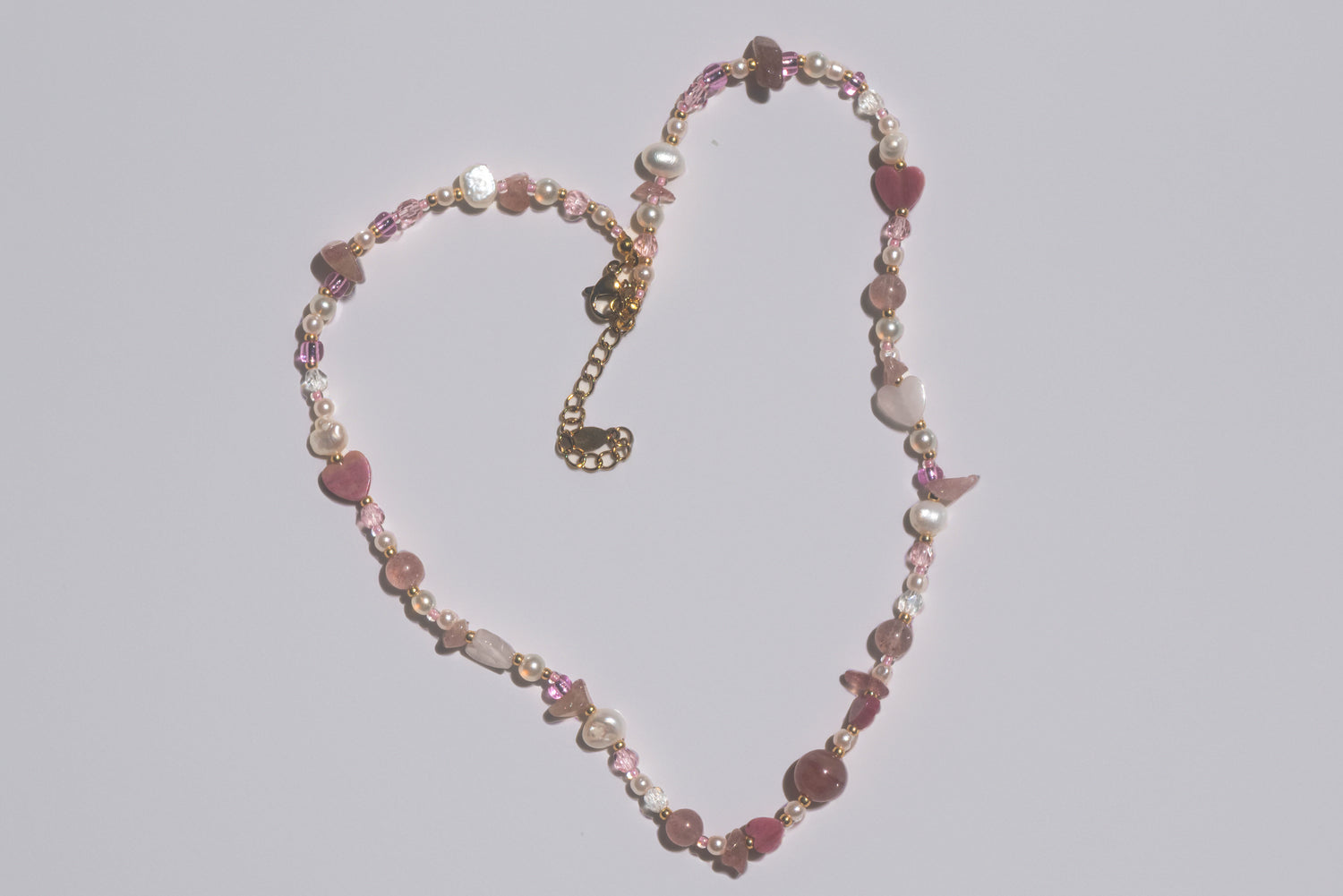 This necklace pays homage to Aphrodite, the goddess of love and beauty. With soft rose quartz, sensual strawberry quartz, and pure freshwater pearls, it embodies the essence of divine femininity. Golden accents bring warmth and elevate the romantic charm of the stones — a graceful ode to sacred love.