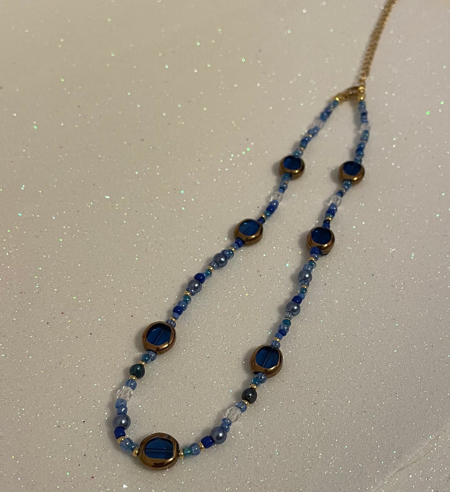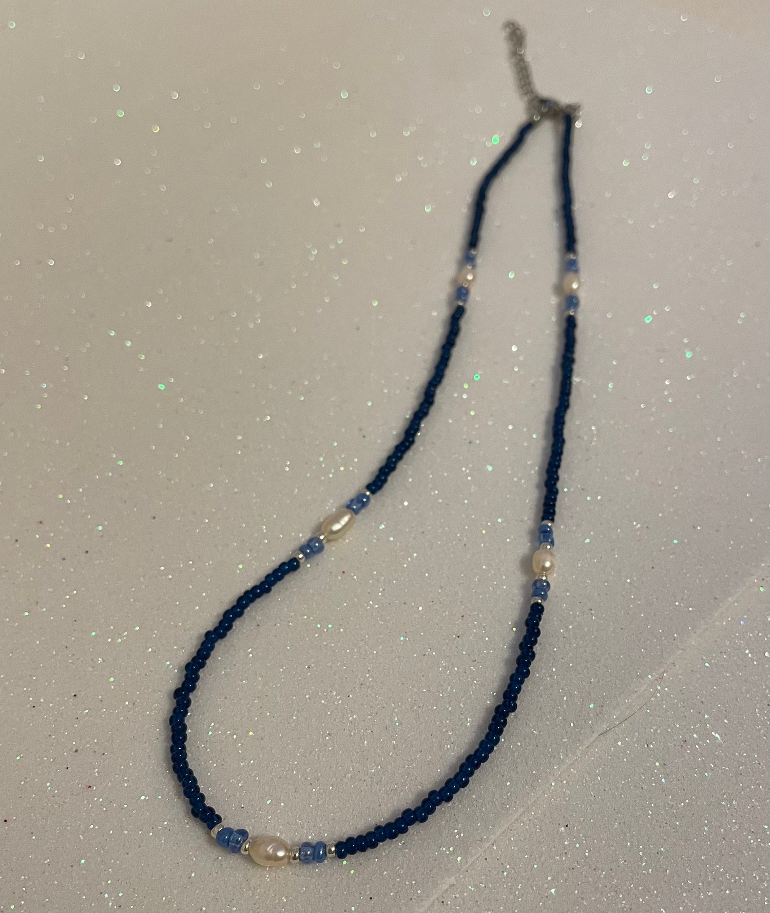 This handmade necklace evokes the galaxy, with dark blue and silver beads representing space and stars, and glossy accents shimmering like the Milky Way.