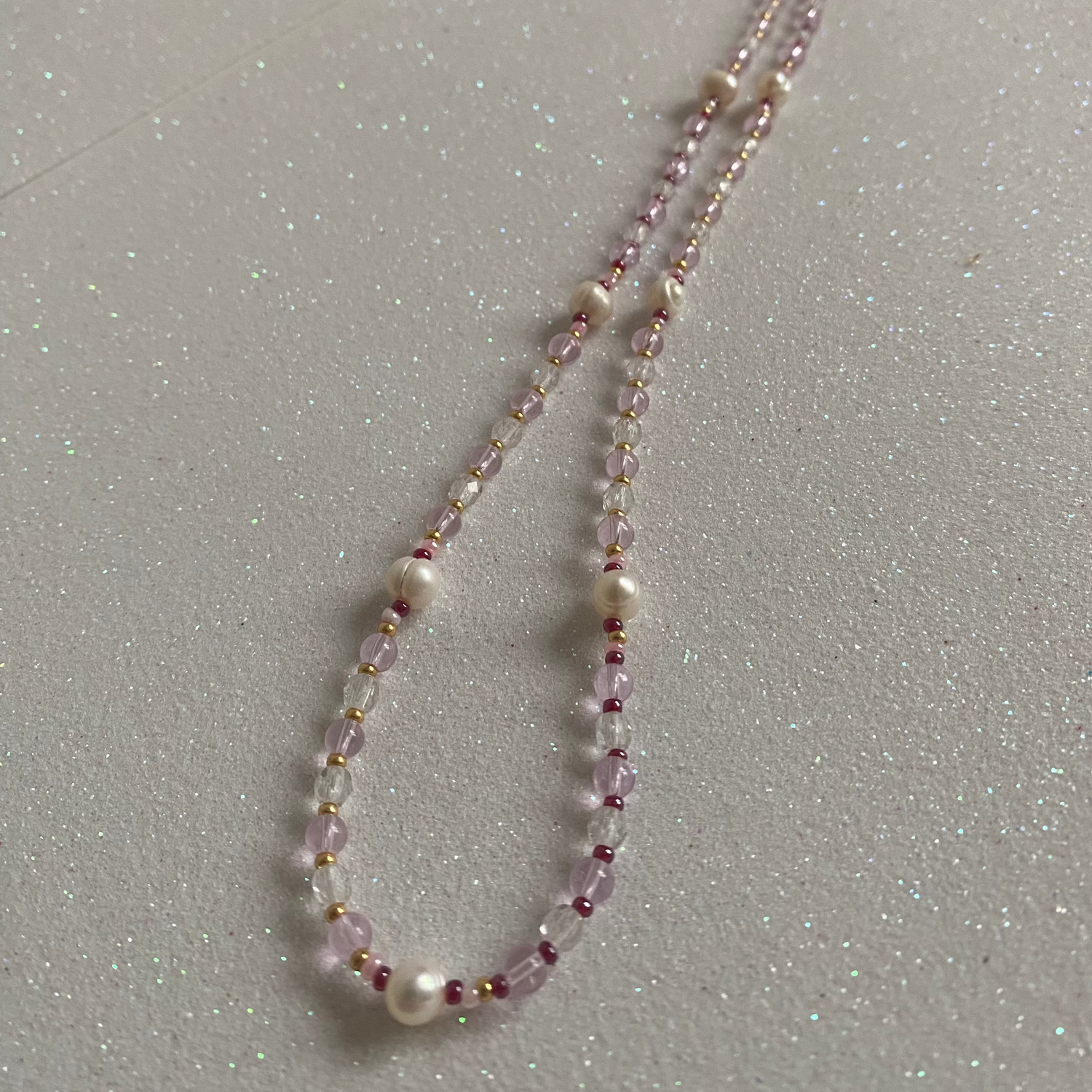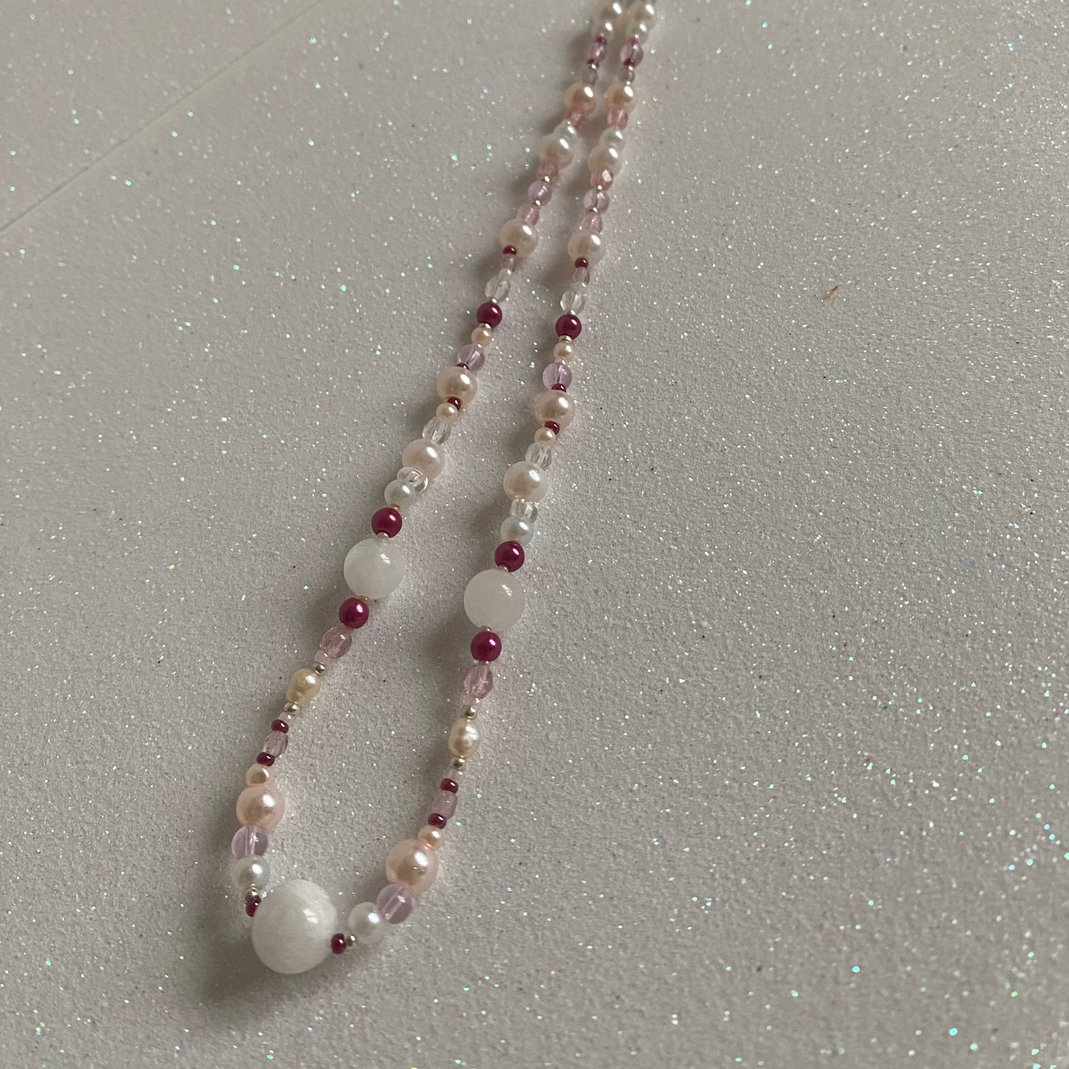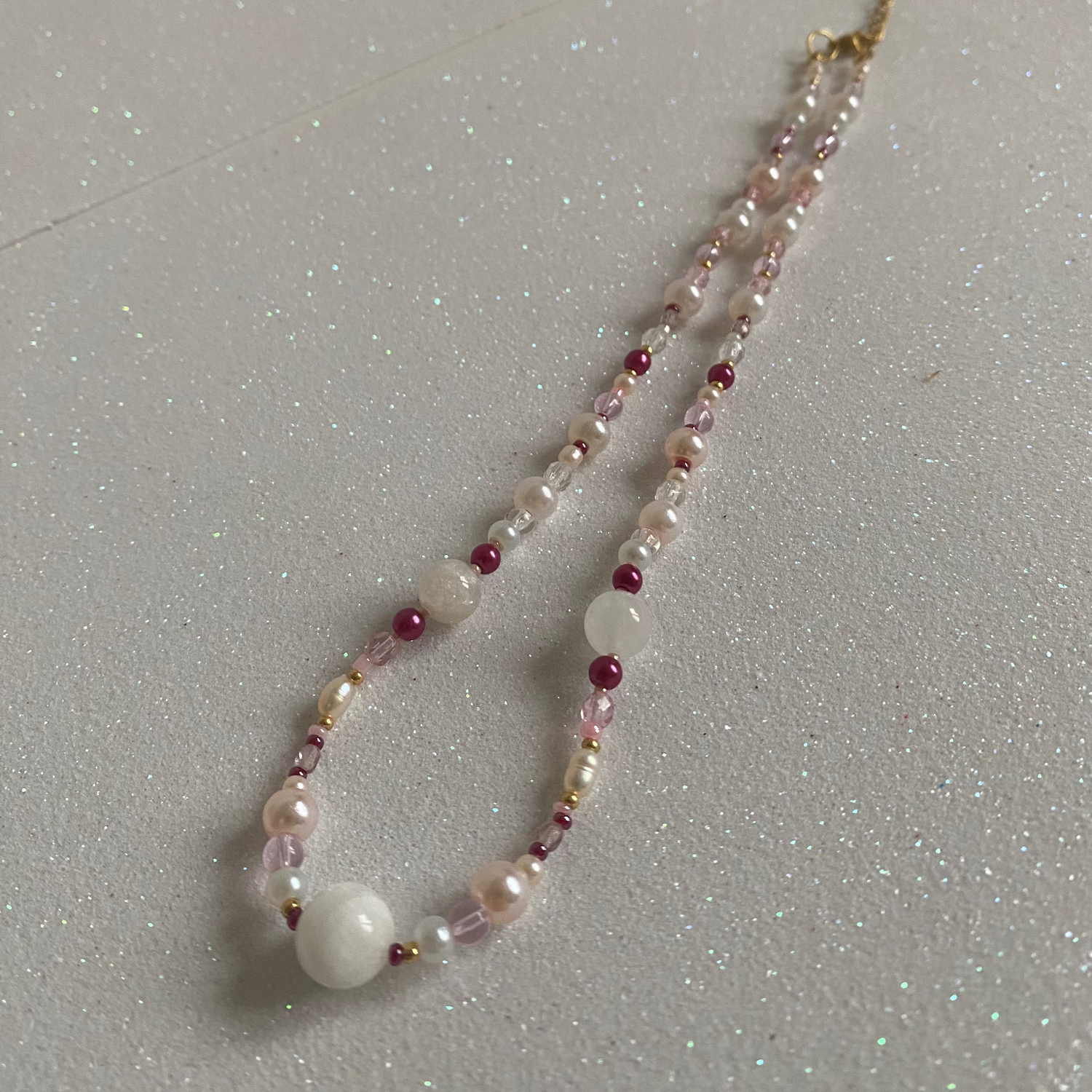 Freshwaterpearls, baby pink, gold, cherry red and glass