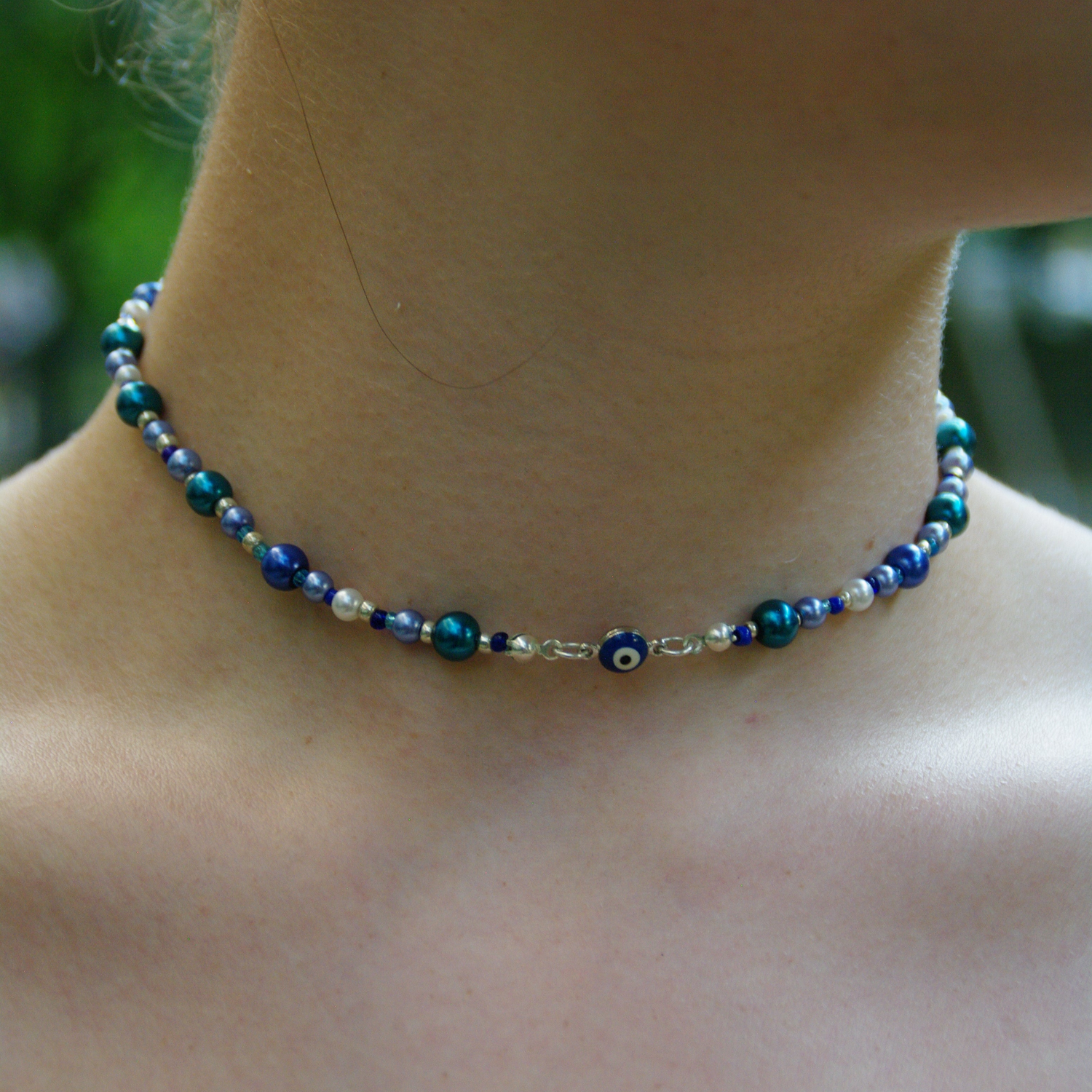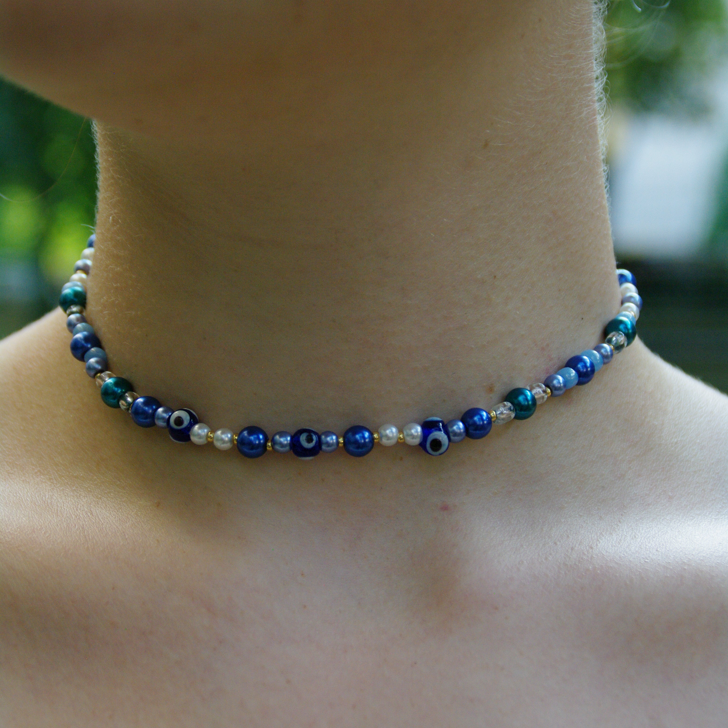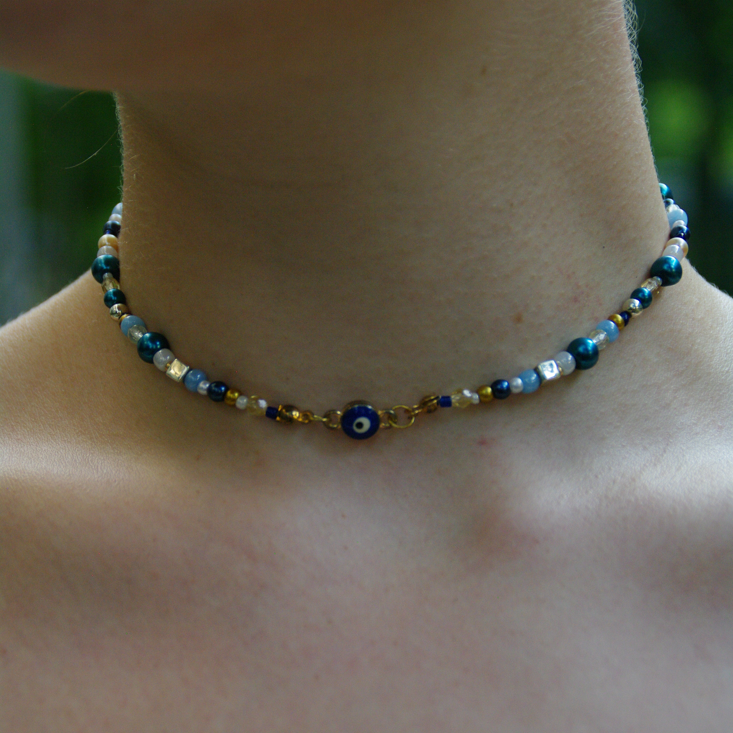 This design blends the protective symbolism of the evil eye with luxurious gold accents, creating a bold and elegant statement piece. The choker’s rich gold elements add a touch of opulence, making it perfect for those who want to elevate their style with something truly distinctive.