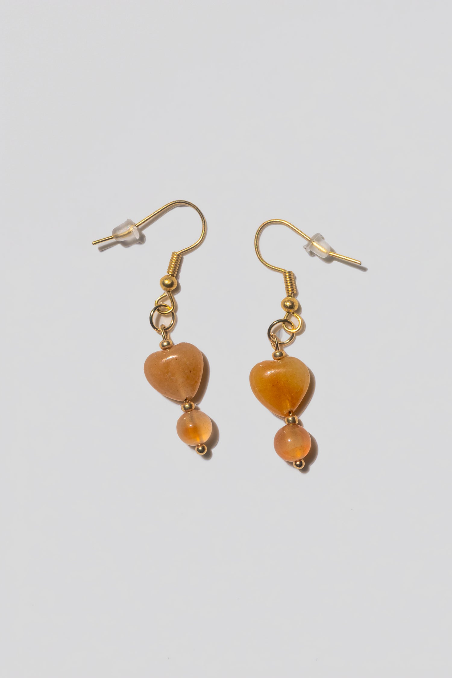 These heart-shaped earrings are made from lighter, orange-red carnelian, symbolizing vitality, life force, and creative energy. The gold setting enhances their warmth and gives them a radiant, uplifting presence.