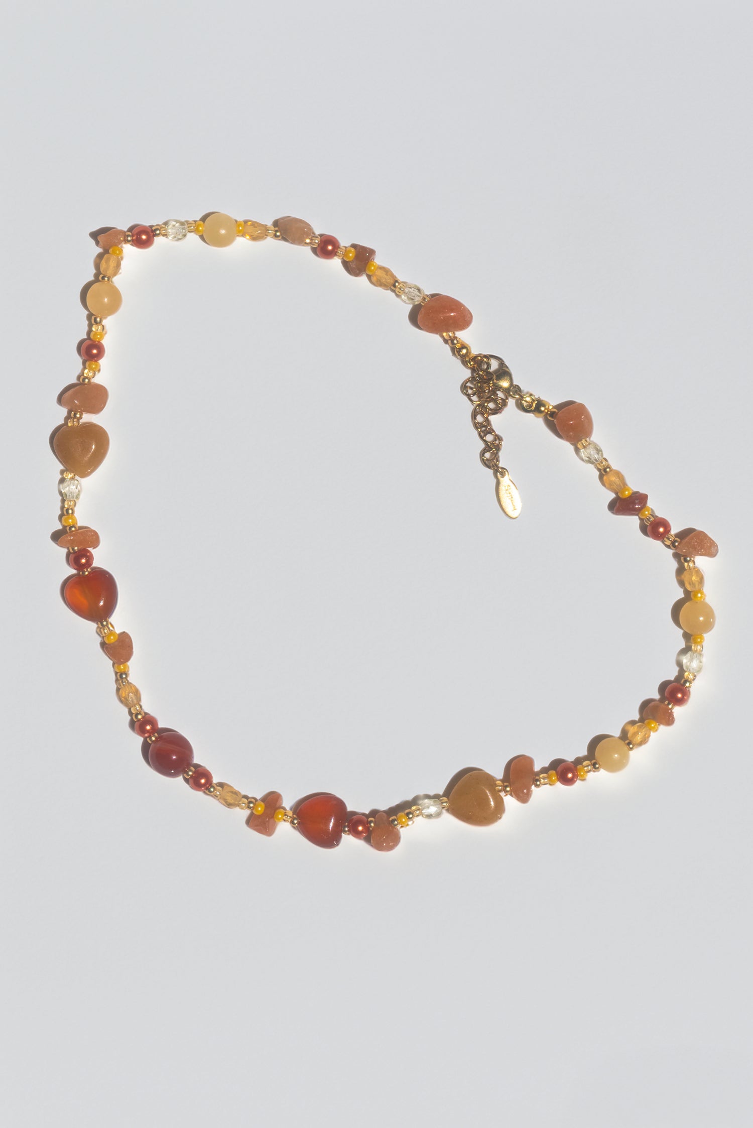 This necklace honors Parvati, the Indian goddess of feminine power and transformation. Fiery red carnelian, golden citrine, and shimmering gold details evoke her passion, strength, and divine radiance. The blend of orange, gold, and translucent elements symbolizes purification, creativity, and life force. A necklace born to awaken your inner fire.