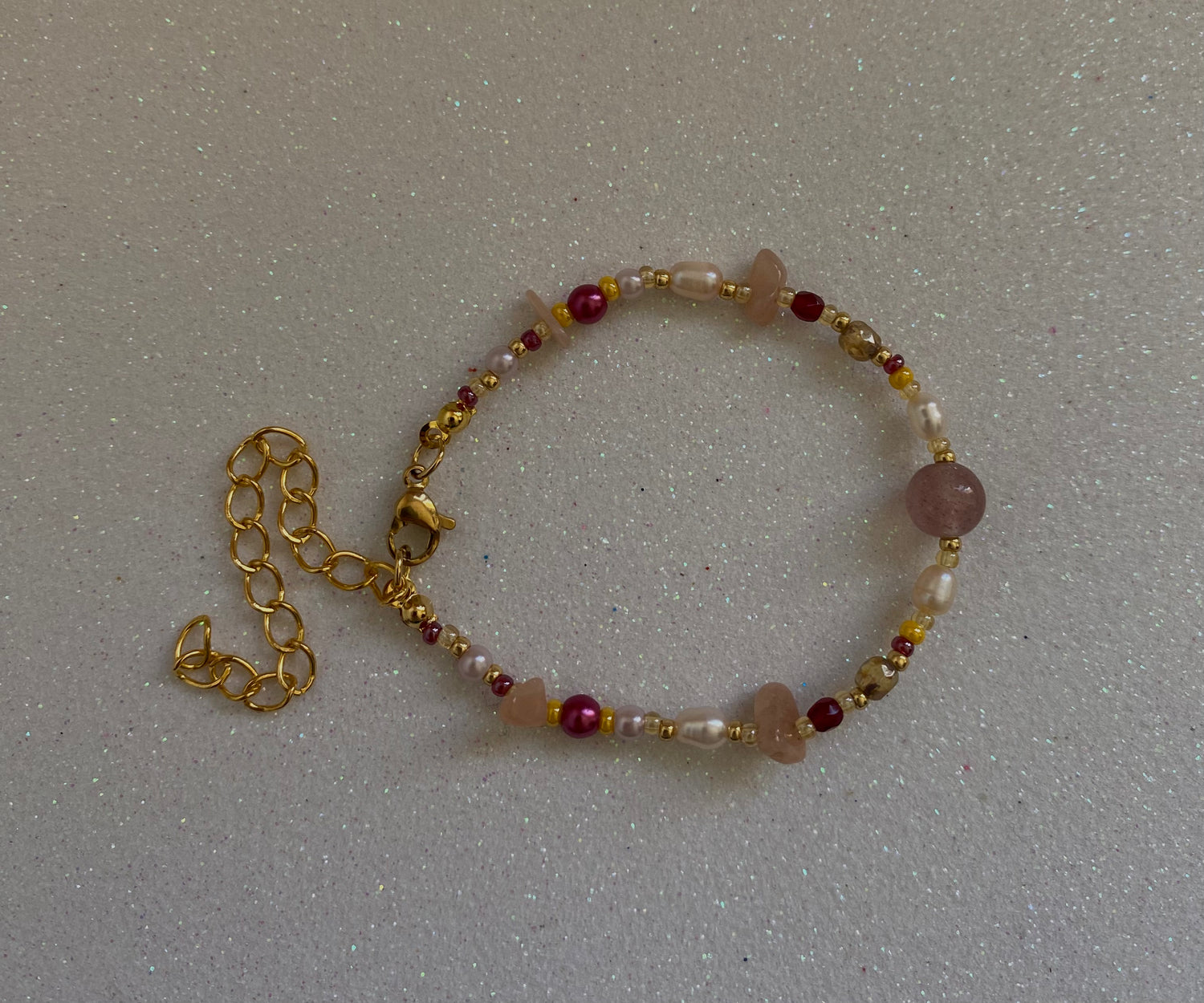 This handmade bracelet, drawing from Renaissance elegance, blends delicate peach pink, bold Naples yellow, and rich dark red, with shimmering accents that embody the period's refined beauty and creativity.