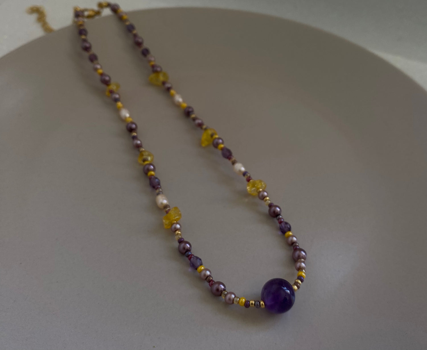 The glass yellow mineral adds a vibrant touch, while the large amethyst serves as a stunning focal point, creating a bold and elegant piece wit the small ivy red accents and freshwater pearls.