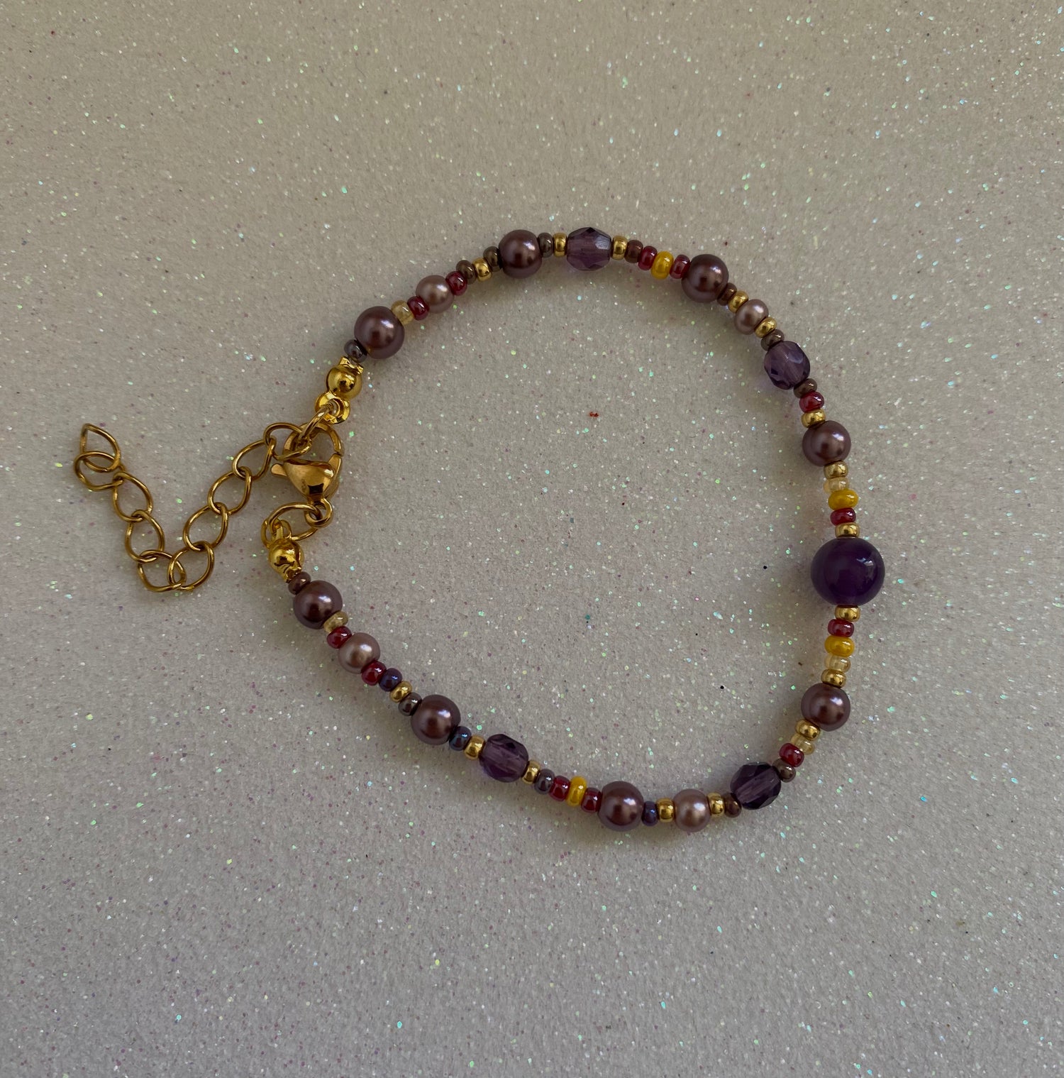 This handmade bracelet features crystal yellow, dark purple, and gold, complemented by small ivy red accents and amethyst mineral, creating a rich and elegant design.