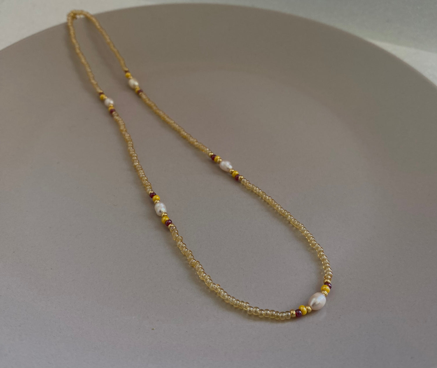 Inspired by Primavera and the Renaissance, this handmade necklace features vibrant sparkling glass yellow, rich dark red, and elegant freshwater pearls, embodying the essence of classic beauty and renewal.