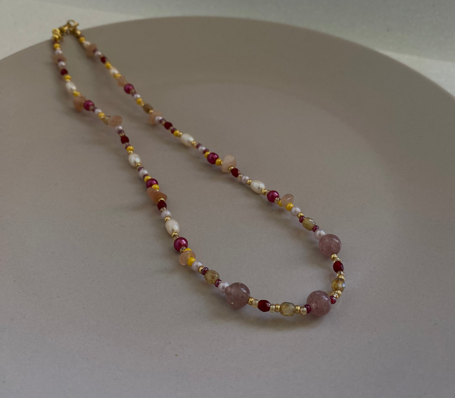 This handmade necklace draws inspiration from Primavera and the Renaissance, featuring soft peach pink, vibrant Naples yellow, and deep red