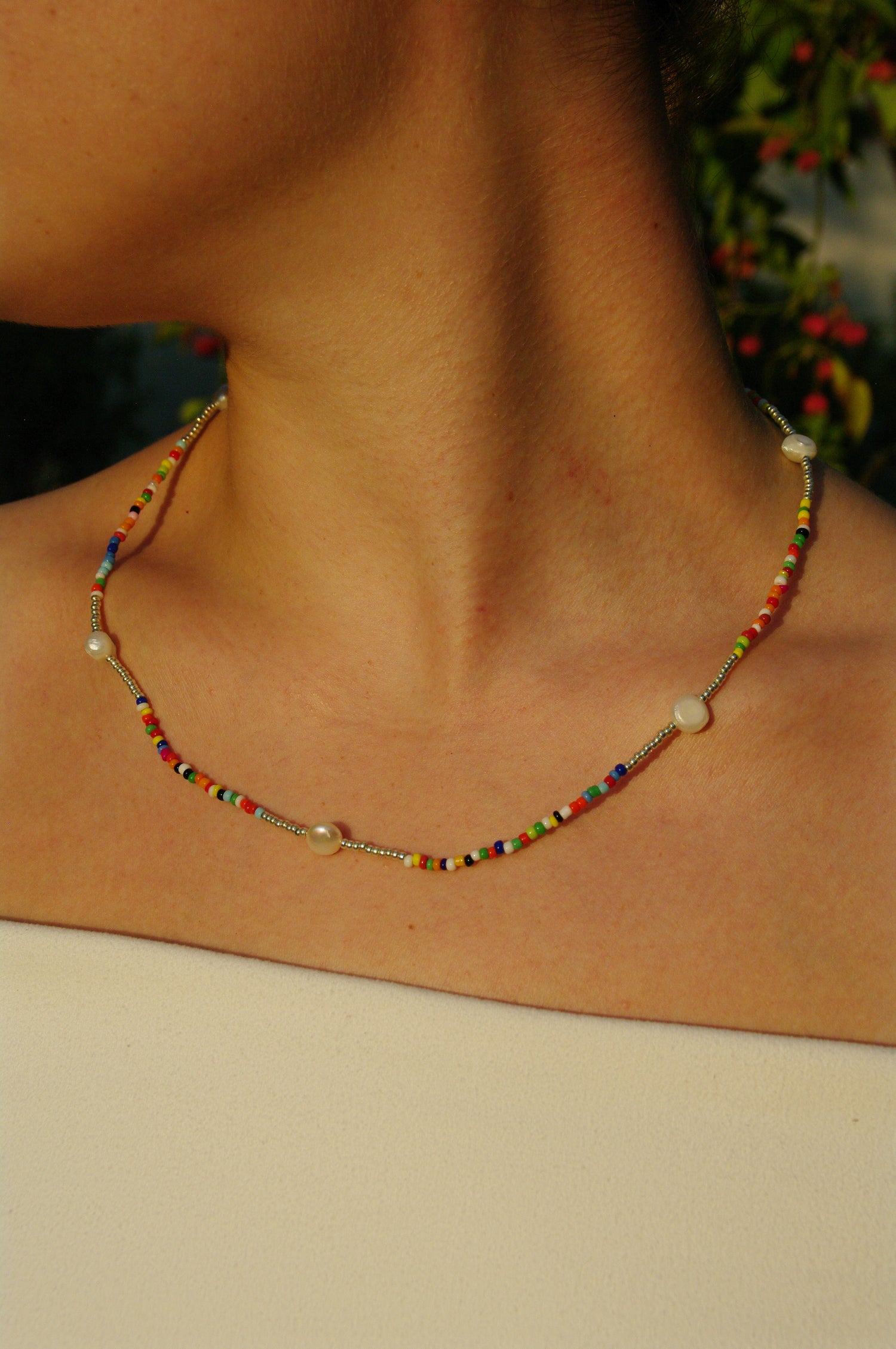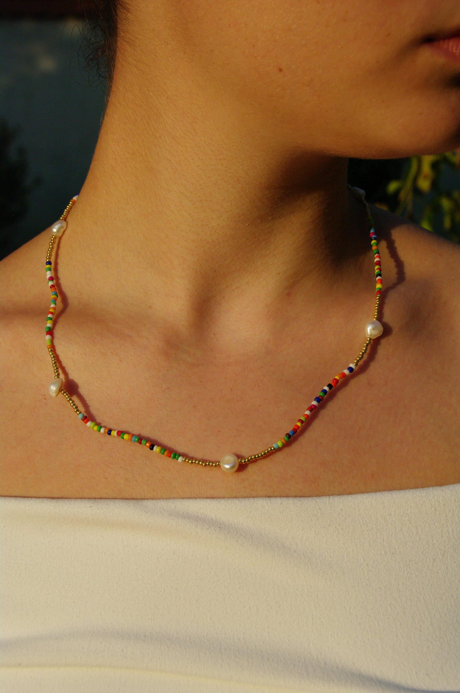 This necklace blends a vibrant array of colorful pearls with prominent freshwater pearls, creating a striking and elegant piece. Its unique mix of colors and design adds a fresh burst of style to any outfit.