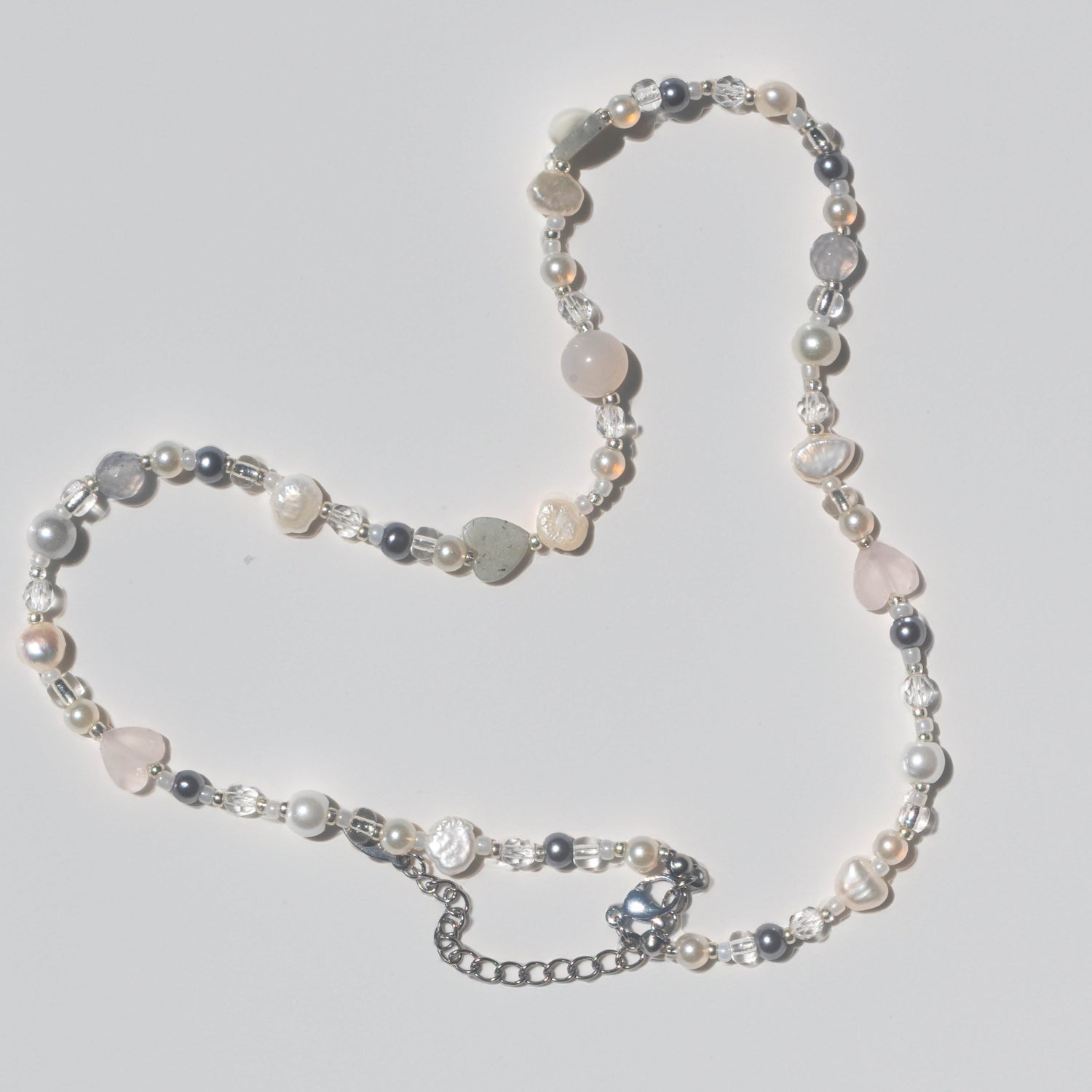 This necklace is inspired by Yūrei, the ethereal female spirit of Japanese tradition. Soft freshwater pearls symbolize eternal femininity, smoky quartz brings depth and memory, milky quartz offers purity, and rose quartz gently supports healing and love. Silver elements enhance the necklace’s ghostlike elegance—a delicate, luminous piece for lovers of quiet beauty.