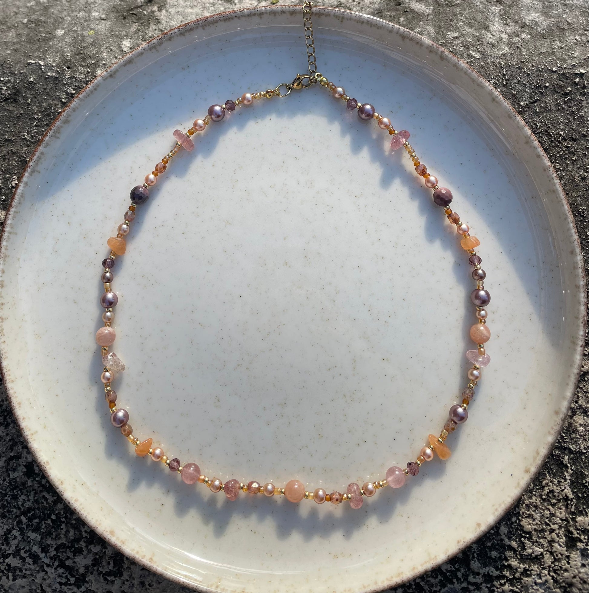 Five smaller moonstones paired with carnelian and strawberry quartz. Radiating in warm orange, lilac, and gold tones, it embodies strength, love, and emotional harmony.