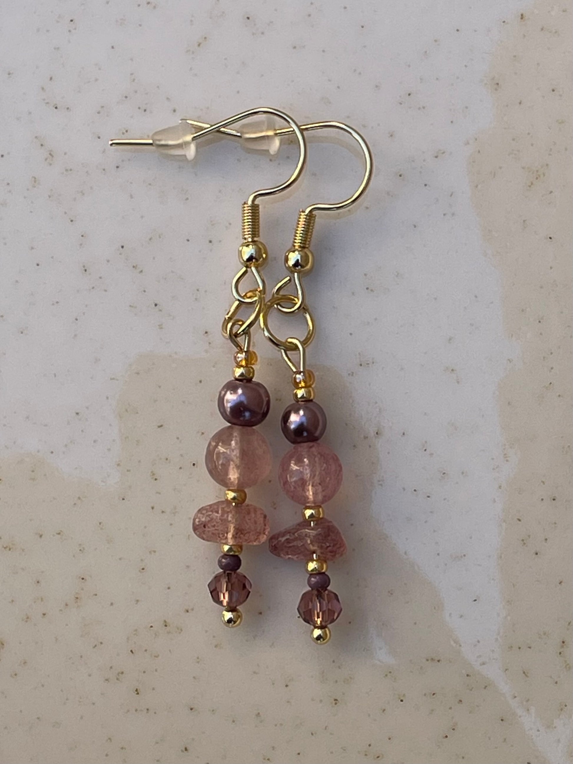 Crushed strawberry quartz, delicate pink, gold, and purple shades, magical and fragile.