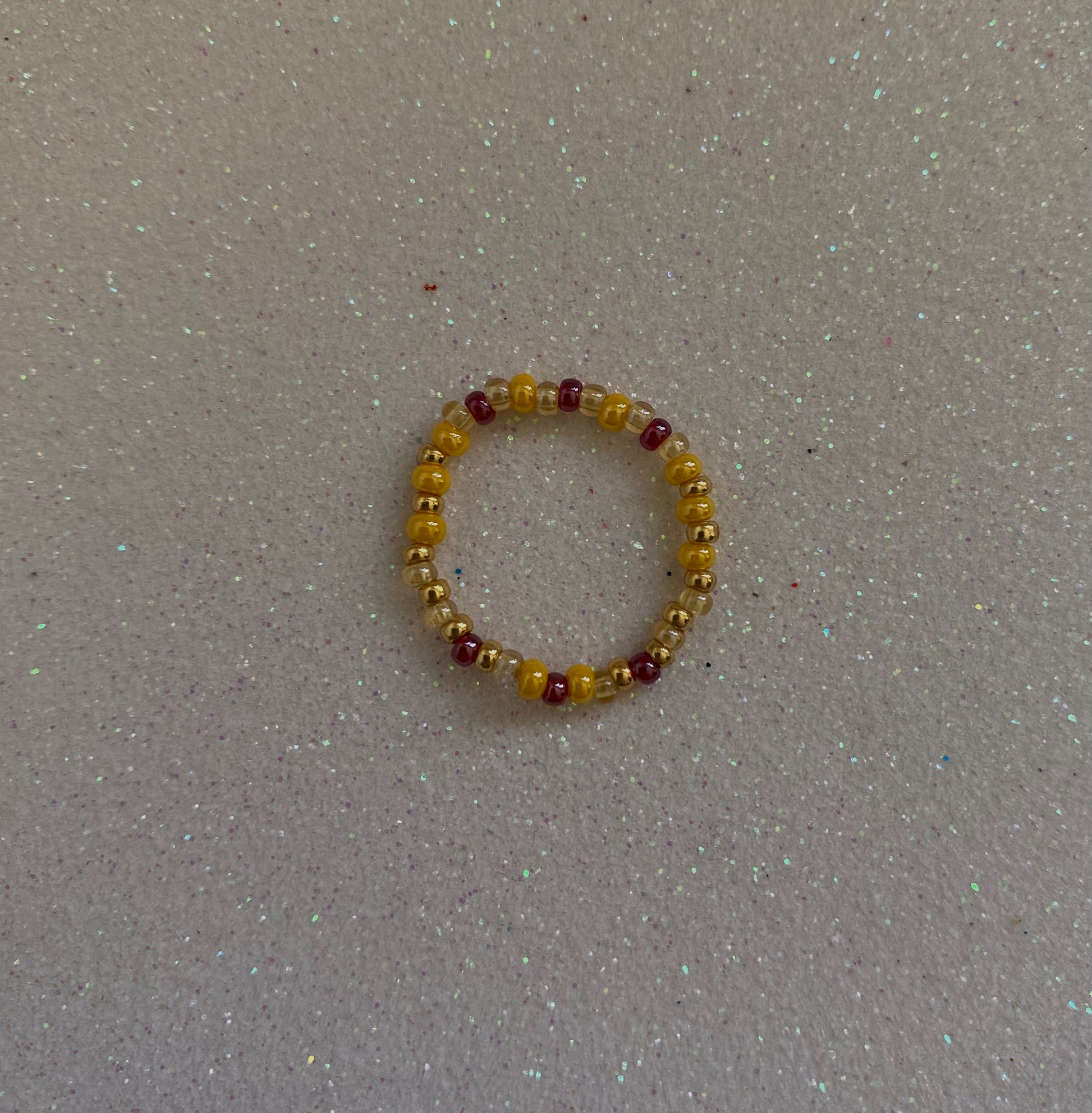 This handmade ring combines soft peach pink, vibrant Naples yellow, and bold cherry red glass accents, creating a unique and eye-catching design with a touch of elegance.